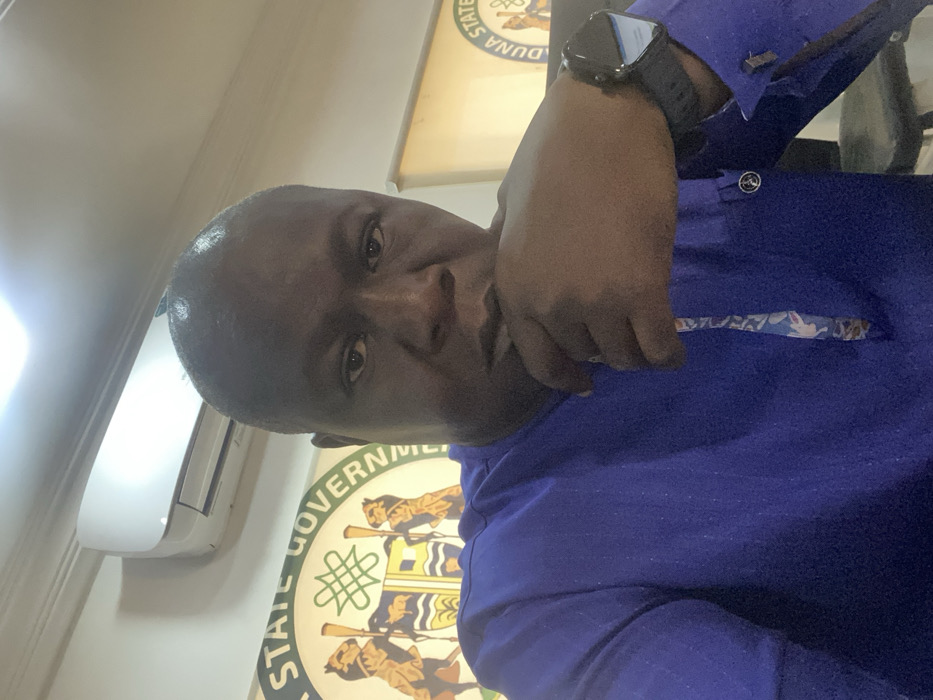 A dark-skinned male, appearing middle-aged with a bald head, is depicted in a medium-close shot. He wears a royal blue long-sleeved tunic with a patterned fabric strip on the placket and cuffs. A black smartwatch is present on his left wrist. His left hand is raised, with fingers touching his chin/mouth area. He maintains direct eye contact with the camera, exhibiting a neutral expression. The background features a cream-colored wall. To the left, a large circular emblem is partially visible, bearing the text "KADUNA STATE GOVERNMENT" around its upper perimeter and displaying a coat of arms with two figures flanking a shield. A similar, partially obscured emblem marked "KADUNA STATE" is visible to the right. Above the subject's head, a white wall-mounted air conditioning unit is installed. The scene indicates an indoor office environment associated with the Kaduna State Government in Nigeria. The specific city of Shaba is not identifiable from the visual evidence provided in the image.