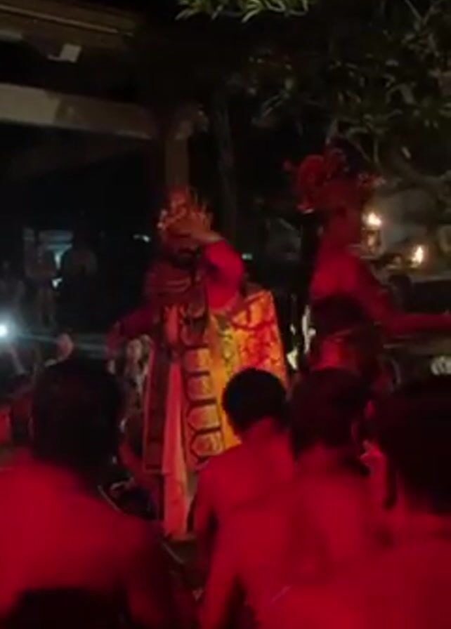 The video depicts a scene of traditional Balinese performance art set at night. Two costumed performers, one seemingly male and the other female, are in the center of the frame. They are adorned in ornate traditional costumes, including headdresses and fabrics with gold embellishments. The stage area is lit with a dim, red lighting that casts long shadows. Surrounding the performers is a semi-circle of shirtless men who appear to be providing vocal accompaniment or chanting. Behind the performers, there is a collection of lit candles on a raised platform, further illuminating the area. The background includes the dark silhouette of a tree and architectural details suggesting a temple or courtyard setting. The overall atmosphere is one of cultural significance and performance.