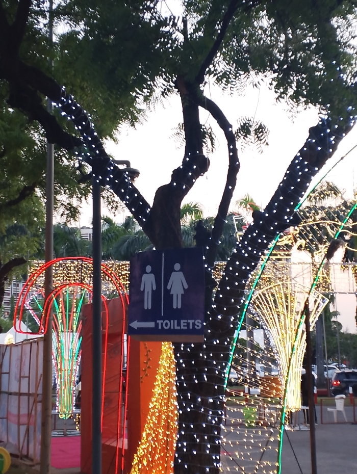 - "A public park scene showcases a "TOILETS" sign with male and female symbols, indicating restroom direction" by FM-kzBcg2, licensed under CC BY 4.0