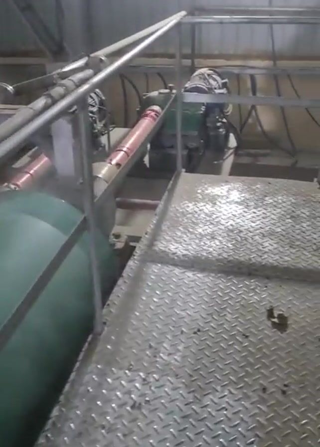 industrial equipment from a medium height perspective. Two red shafts with universal joints are visible, connecting to motors and machinery. The equipment is located on an elevated platform with a diamond-patterned metal surface and a gray metal railing. Steam or vapor is rising from one of the large cylindrical structures. The surroundings appear to be an industrial building, with pipes, overhead lighting, and metal structural elements visible.