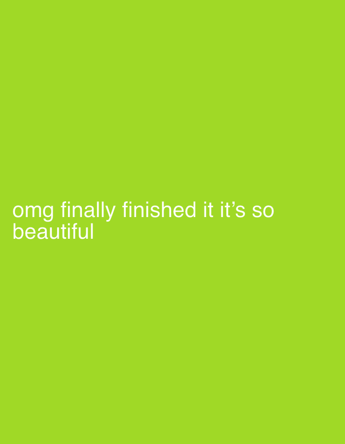 A light green background fills the entire frame. At the bottom left, the text "omg finally finished it it's so beautiful" is displayed in a simple white font. The text is left-aligned and takes up two lines. The overall image conveys a sense of accomplishment and admiration.