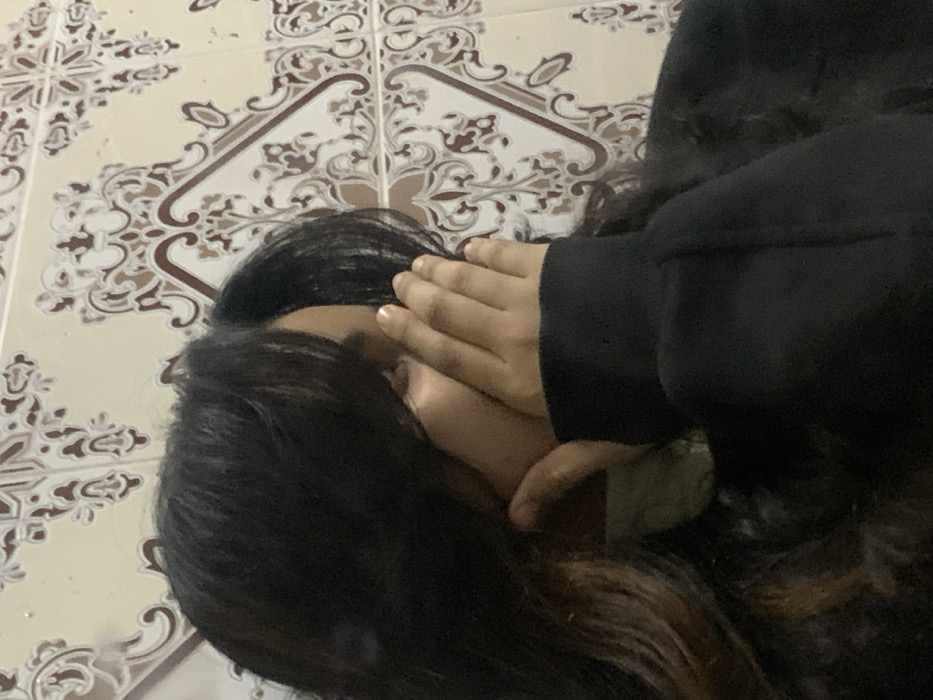 A person with dark hair, some of which is light brown at the ends, covers their face with their hands. They are wearing a black hoodie. The background features beige and brown patterned tiles. The image is taken from a high angle, focusing on the person's face and the texture of their hair.