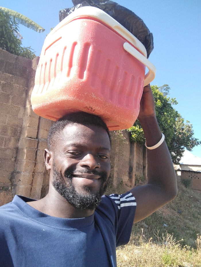 An adult male with dark skin, short dark hair, and a full dark beard smiles directly at the camera. He wears a navy blue short-sleeved t-shirt with three white stripes on the left sleeve and a white bracelet on his right wrist. A large, rectangular, salmon-pink cooler with a white lid and handle is balanced on his head, with a black plastic bag placed on top of it. His right arm is raised, with his hand touching the cooler, presumably for support. The background to the left features a weathered light brown concrete block wall with green foliage visible above it. To the right, there is a grassy, sloping embankment with a prominent green-leafed tree and a distant, partially visible building with a corrugated roof. The sky is clear and blue, indicating bright daylight. The scene takes place in the city of Gura Top, Nigeria.