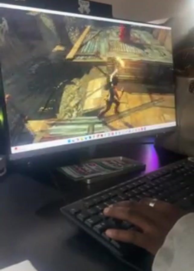 A person is playing a video game on a desktop computer