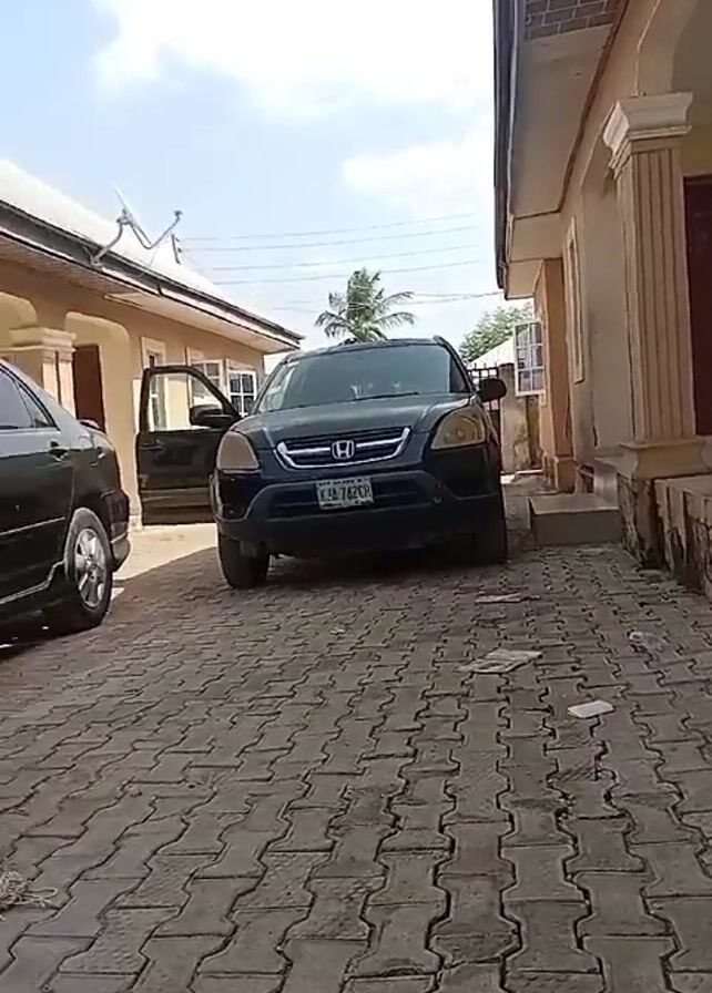 A daytime shot shows a courtyard between two buildings paved with gray bricks arranged in a herringbone pattern. On the left, a black sedan is parked. On the right, a black Honda CRV is parked with its driver-side door open. In the background, a person in dark clothing walks towards the Honda CRV. Both buildings are painted in beige with off-white trim. The sky is blue with scattered white clouds. Two satellite dishes are mounted on the roof of the building on the left. A small palm tree is visible in the distance.