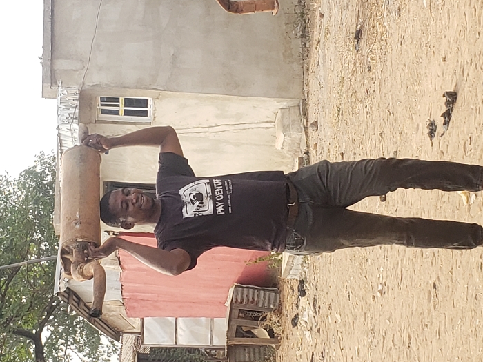 A man stands outdoors holding a cylindrical, rusty metal object, possibly a pipe or container, above his head with both hands. He wears a dark t-shirt with a logo and dark pants. Behind him, there is a building with a window and another low structure with a red side. The ground appears to be sandy or dirt. The image quality is somewhat grainy.