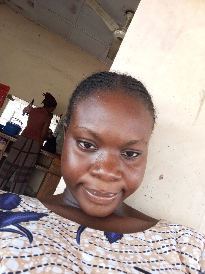 A woman with braided hair smiles into the camera. She has dark skin and a patterned shirt. In the background, another woman is standing near a window. The ceiling is visible with a fan, and there's a white wall beside the subject. A basket and possibly a drink can be seen on a nearby table.
