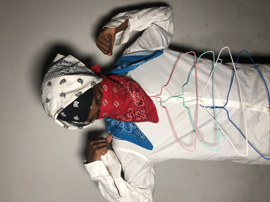 An individual lies on a gray surface, dressed in a white shirt. The person's head is wrapped in a black, white, and red bandana. A blue bandana is also visible. The person's left arm is bent, and their hand is clenched into a fist. The person is also surrounded by several colorful metal hangers.