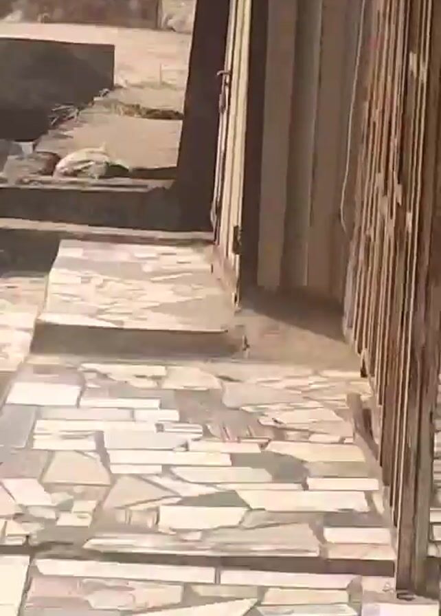 dirt street in a city. There are cars and vans parked on the side of the street. A man is walking down the street. There is a building in the background. The camera is behind a metal fence. There are concrete blocks on the side of the street. There is a large white pole being transported by a vehicle with two wheels.
