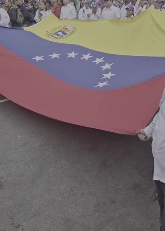 A crowd marches down a street, holding a large Venezuelan flag. The flag is yellow, blue, and red, with an emblem and white stars. Many people in the crowd wear white. Buildings with palm trees can be seen in the background. The person filming is holding onto the flag.