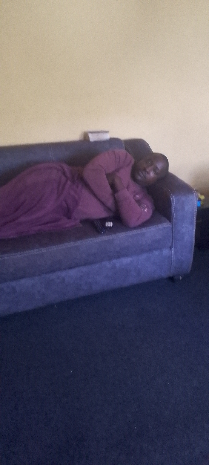 An indoor domestic setting in Unknown, Unknown. A bald adult male, dark complexion, lies on his left side on a dark gray upholstered sofa. He wears a maroon long-sleeved top and matching pants. His head rests on the sofa's armrest, facing the camera with a neutral expression. His arms are bent and crossed over his torso. A black remote control with white buttons rests on the sofa cushion in front of his midsection. The wall behind the sofa is painted light yellow, and a light-colored rectangular object is positioned on the back of the sofa, against the wall. The floor is covered with dark blue carpet.