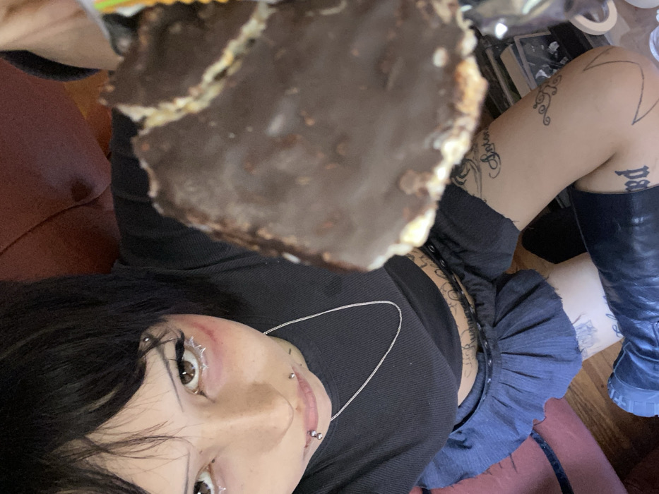 An individual in a black top, mini skirt, and black boots holds a chocolate-covered rice cake close to the camera. The person has multiple piercings on their nose and lip, and striking white makeup around their eyes. Tattoos are visible on their leg. They are positioned in what looks like a living room setting, with a glimpse of a red couch and hardwood floor. The picture is angled upwards towards the subject.