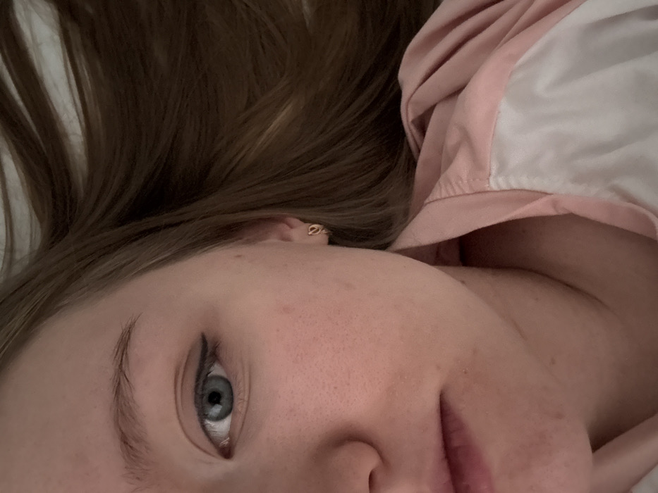 A close-up, angled portrait captures the left side of a young adult female's face, positioned in the city of Nizhnekamsk, Russia. The subject's fair skin exhibits visible pores and minor blemishes on the cheek. Her left eye, with a blue-grey iris and visible pupil, features a distinct black winged eyeliner on the upper lash line. The left eyebrow is light brown and naturally shaped. A partial view of the nose and slightly parted lips is visible towards the lower left. The left earlobe is adorned with a small, gold-colored hoop earring, which appears to be shaped like a heart or a knot. Long, light brown hair cascades across the upper right portion of the frame. The subject is wearing a light pink and white two-toned garment, possibly a top or jacket, visible on the lower right, featuring a collar or lapel and visible seam lines. The background is an indistinct, plain, light-colored surface, suggesting an indoor environment with soft, even illumination. The individual's expression is neutral, and she appears to be looking slightly downwards or towards the camera.