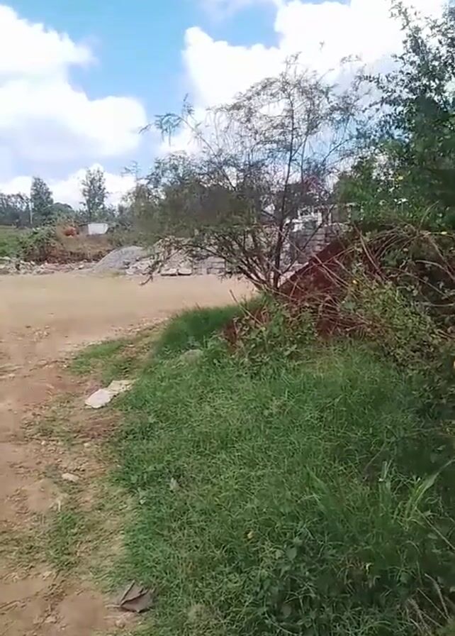 dirt road leading to a construction site under a blue sky with scattered clouds. The road is bordered by green grass and a small tree on the right. In the distance, construction materials are piled up, and a few trees dot the horizon. The camera remains stationary throughout the video.