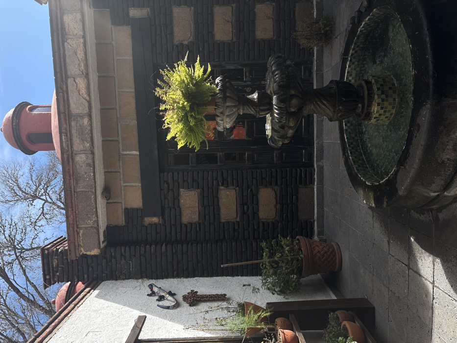 A courtyard scene features a tiered stone fountain, adorned with a vibrant fern, positioned near a building with dark, textured brickwork. The building’s design includes lighter-colored rectangular insets and a glimpse of a red-domed structure against a bright sky. A white wall displays decorative elements like a lizard and cross. Various potted plants add to the courtyard’s ambiance, some arranged on a low wooden shelf.