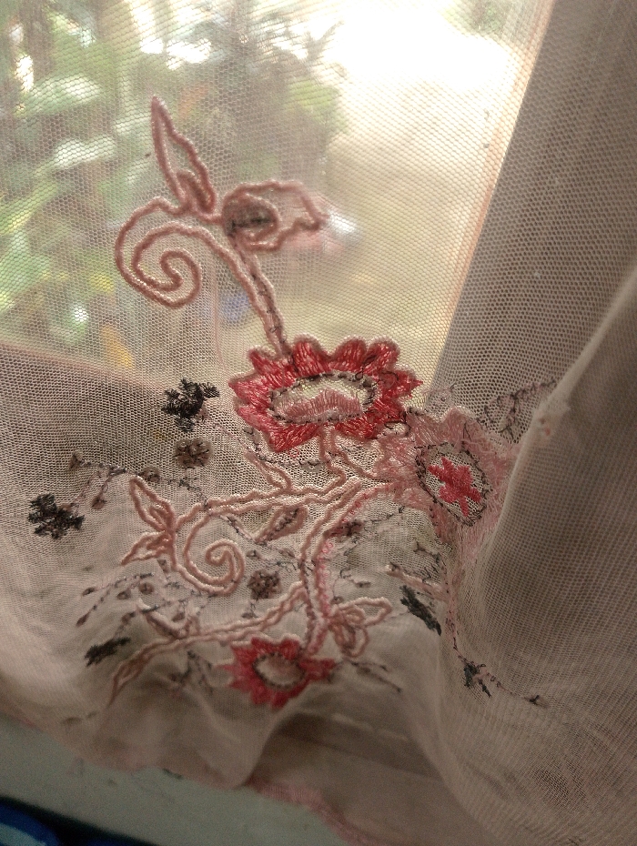 The image displays a close-up view of a light-colored, translucent fabric, identified as a curtain, adorned with embroidered floral and vine motifs