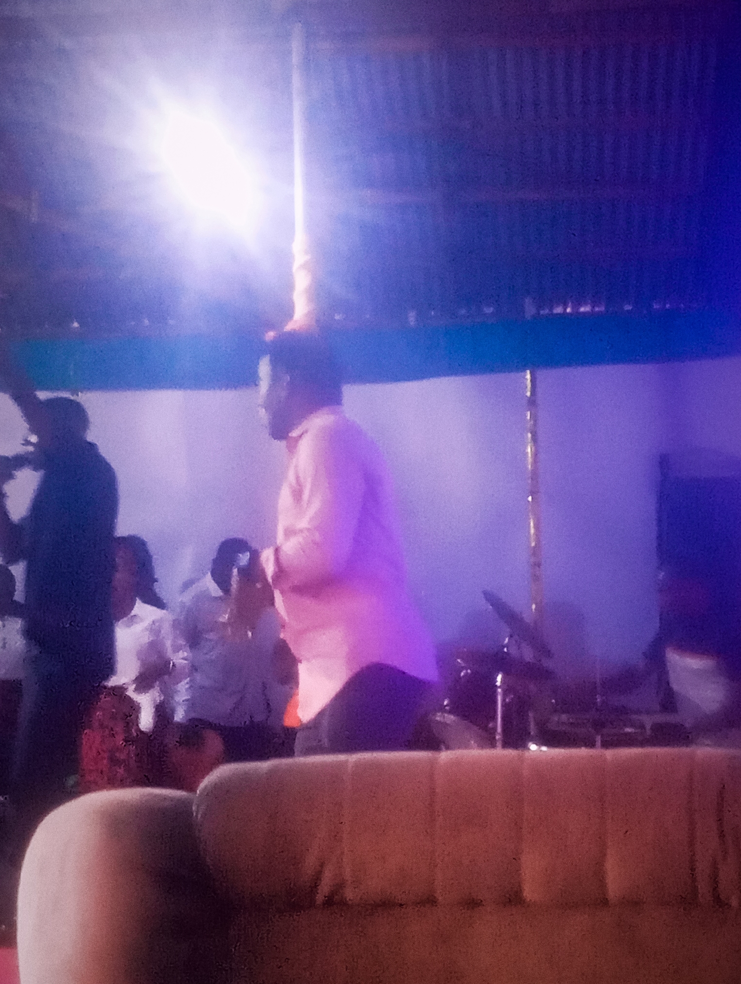 The image appears to be taken at a gathering in Makurdi, Nigeria. Several people are present, including a man in a pink shirt standing in the center. To his left are a few other individuals, one of whom is holding a phone. In the background, there's a drum set and some decorations. The foreground shows a section of a brown couch. The overall lighting is dim, with a bright light source visible in the upper part of the image.
