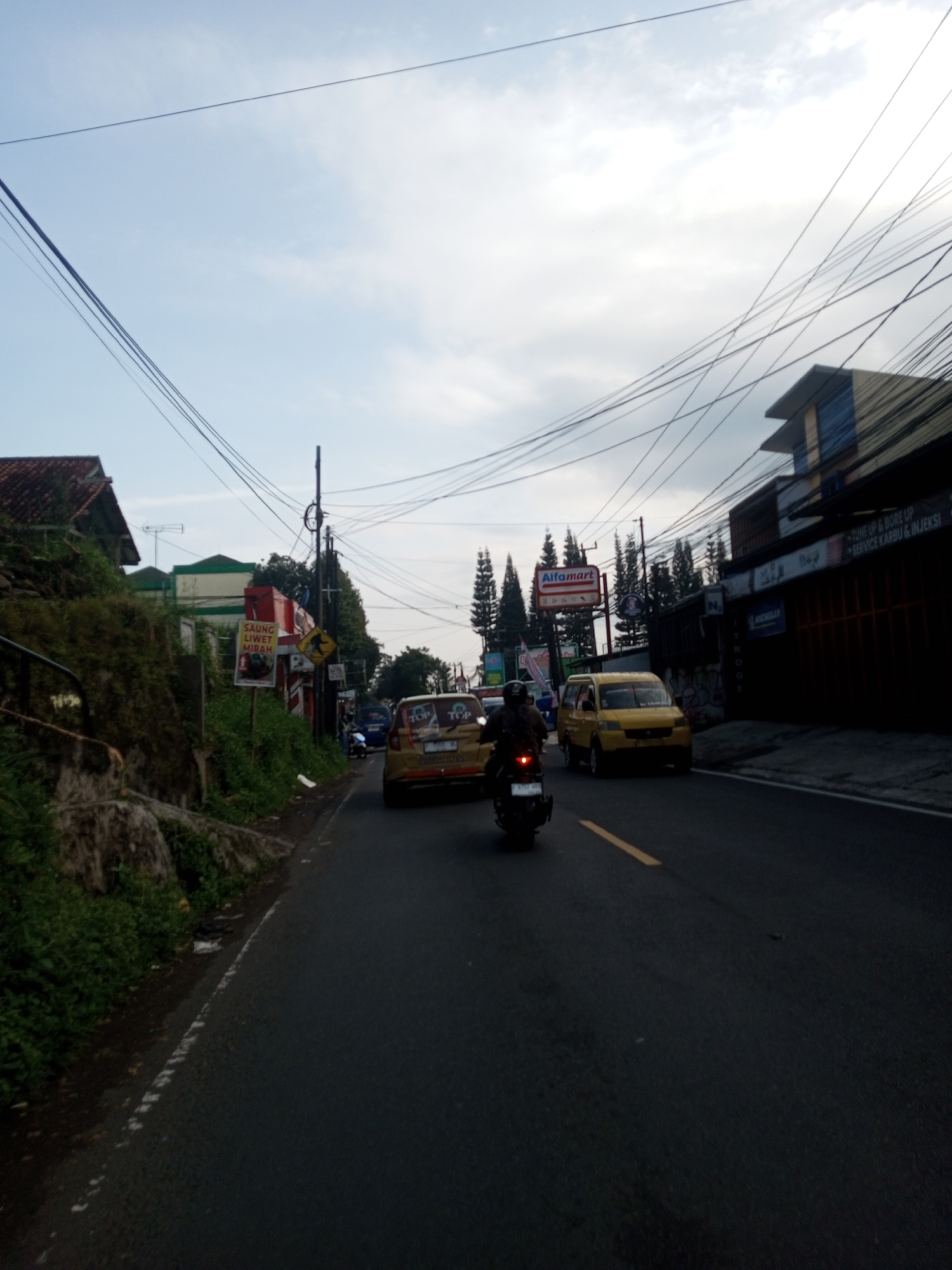 The image depicts a street scene with vehicular traffic, including a motorcycle, a yellow car, and a yellow van. An "Alfamart" sign is visible in the background, with some trees and buildings. Power lines are strung overhead. The location is not in Mya Sit Kaing Ywar Thit, Myanmar; the presence of Alfamart and the written text on the signs indicate this is likely in Indonesia. The environment appears to be a hilly or mountainous region.