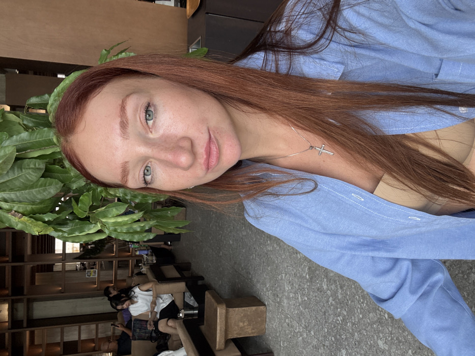 A red-haired woman with freckles poses indoors near a plant. She wears a light blue button-down shirt and a tan top. A silver necklace with a cross pendant adorns her neck. The background shows a cafe-like setting with other patrons seated at tables. The floor appears to be a gray marble or concrete. The woman is positioned on the right side of the image, while the plant and the cafe interior occupy the left side.