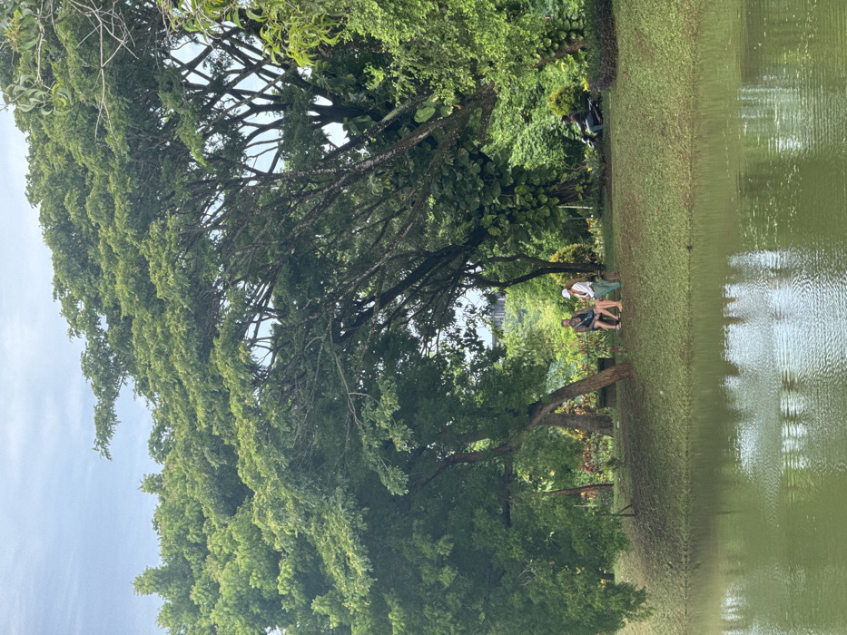 A tranquil scene shows lush greenery meeting the edge of a calm body of water. Mature trees with dense foliage dominate the left side of the frame, their branches reaching toward the sky. Three individuals stand on the grassy bank near the water, appearing to be engaged in conversation. The reflections on the water's surface add depth, while the sky suggests overcast weather.
