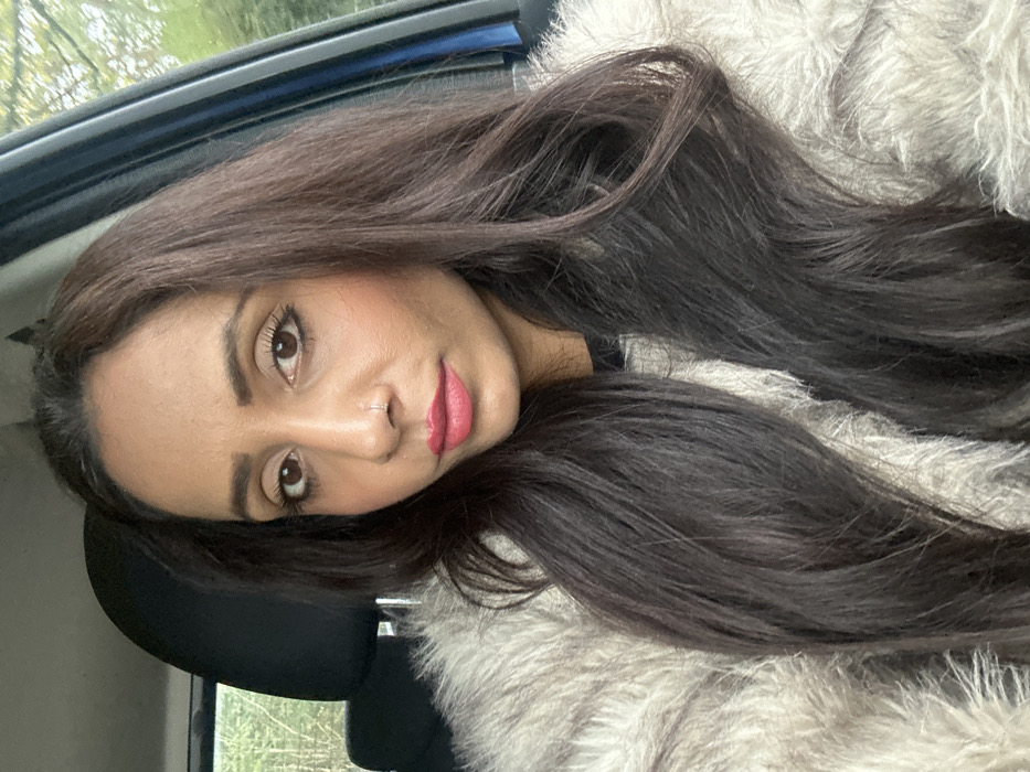 A woman is depicted in a medium close-up portrait, seated inside a vehicle in Winslow, United Kingdom. She has medium-brown skin, dark brown eyes, and long, dark brown, wavy hair that extends over her shoulders. She is wearing a light gray or beige long-pile, fluffy garment. Her facial features are enhanced with eyeliner, mascara, light pink blush, and pink lipstick. A small silver nose ring is visible in her right nostril. She looks directly at the camera with a neutral expression. Behind her, a black car seat headrest is visible to the left, and a blue car door interior is partially visible to the right. Blurred green foliage, consistent with trees or bushes, is visible through the car window in the background. The scene is illuminated by natural daylight.