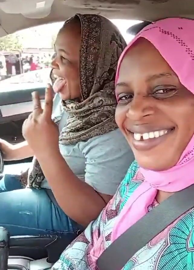 Two women are in a car. The woman on the left is driving while wearing a gray shirt, blue jeans, and a patterned scarf. She makes a peace sign and sticks out her tongue. The woman on the right wears a pink hijab and patterned top. Both women are smiling and wearing seatbelts. Cars can be seen through the windshield in the background.