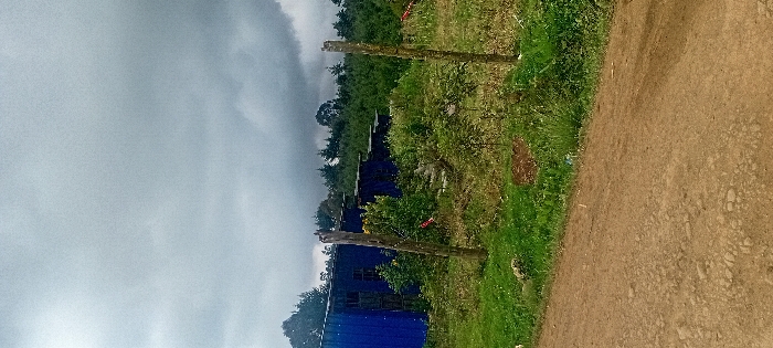The scene depicts an outdoor landscape in Kinale ward, Kenya, characterized by an unpaved environment under a heavily overcast sky. A rough dirt road, displaying varied textures and small stones, occupies the lower third of the image. It is bordered on the right by a strip of green grass and scattered low-lying vegetation. In the midground, two weathered wooden fence posts stand vertically, framing an area densely covered with green grass, shrubs, and small, leafy trees. Beyond this vegetation, a structure constructed from bright blue corrugated metal sheets is visible on the left, featuring multiple dark, rectangular openings resembling windows. To the right of this primary blue structure, and set further back, another dark blue or grey corrugated metal building with a stepped roofline is partially visible amidst the dense foliage. The background consists of a sprawling, dense forest composed primarily of dark green conifer trees. No individuals, overt actions, or interactions are discernible within the frame.
