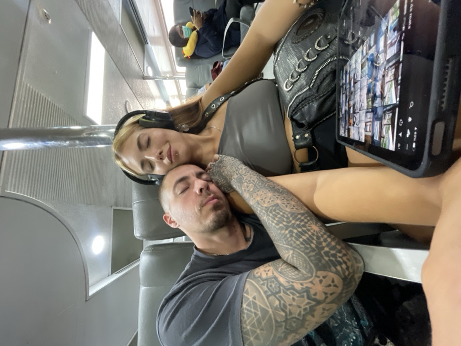 The image depicts the interior of a passenger transport vehicle, identified as being in the city of Tong Yang, Thailand. Two individuals are present in the foreground, with a third person visible in the background. The male subject, positioned on the left, has a shaved head, light facial stubble, and closed eyes, resting his head on the right shoulder of the female beside him. He wears a dark grey short-sleeved t-shirt. His left arm, visible from shoulder to wrist, is heavily tattooed with complex geometric and ornate patterns. A faint gold chain is visible around his neck. The female subject, to the right of the male, has long blonde hair and closed eyes, wearing black over-ear headphones. She has a labret piercing below her lower lip and an earring in her visible ear. She is attired in a grey strapless top. A black fanny pack or small bag, featuring silver rings and studs, is positioned across her waist. A black smartphone, displaying a gallery of small images, rests in the lower right foreground, partially on her lap. In the background, to the right, a third individual is seated, wearing a dark blue top, a light blue surgical mask, and a yellow travel neck pillow. This person is observed looking down at a smartphone. The interior environment features rows of light grey upholstered seats with armrests. The ceiling is white or light grey with horizontal slat-like panels and integrated lighting fixtures. A vertical metallic pillar is visible in the center of the frame. Windows are visible on the right side, admitting ambient light.