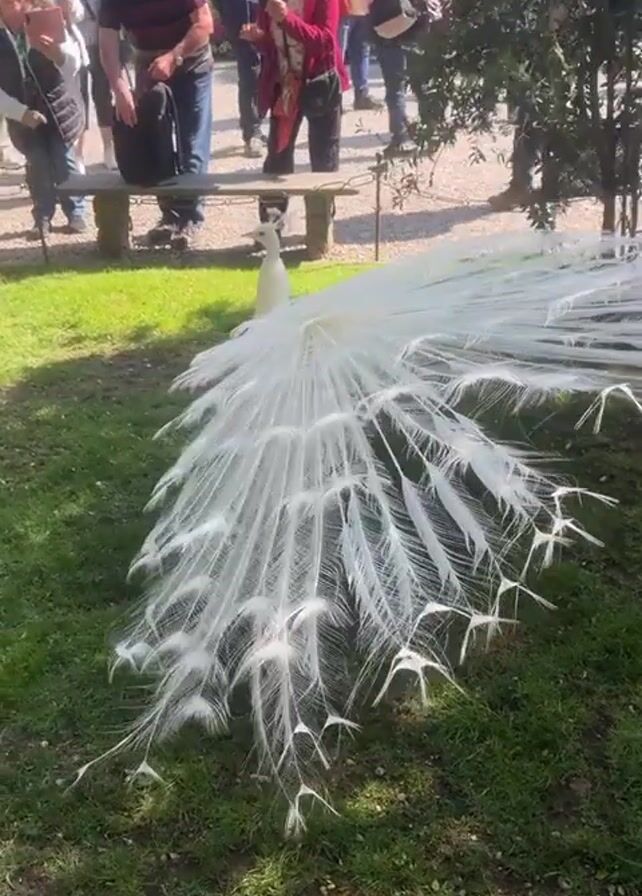 white peacock standing on a green lawn with its tail feathers fully displayed. A group of people stands behind the peacock, observing it. Some are taking pictures. The environment includes trees and a bench. The video appears to be taken outdoors during the day, with natural lighting.