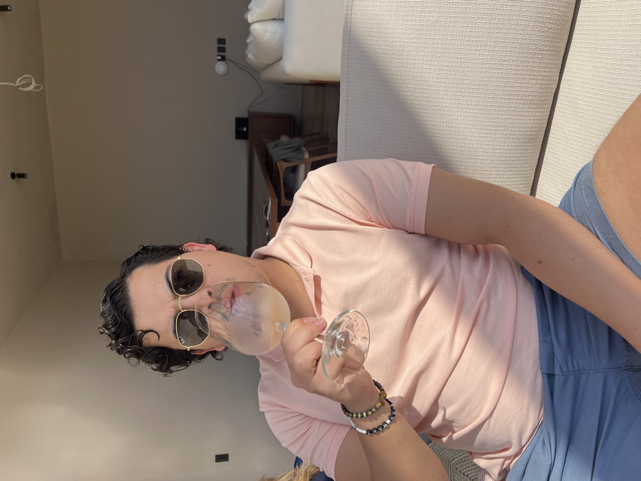 A man lies on a cushioned surface, wearing a pink polo shirt, blue shorts, and sunglasses. He holds a wine glass with a light-colored beverage. Bracelets adorn his wrist. The background includes a room with minimal decor, featuring a sofa, table, and visible wiring. The image is rotated.
