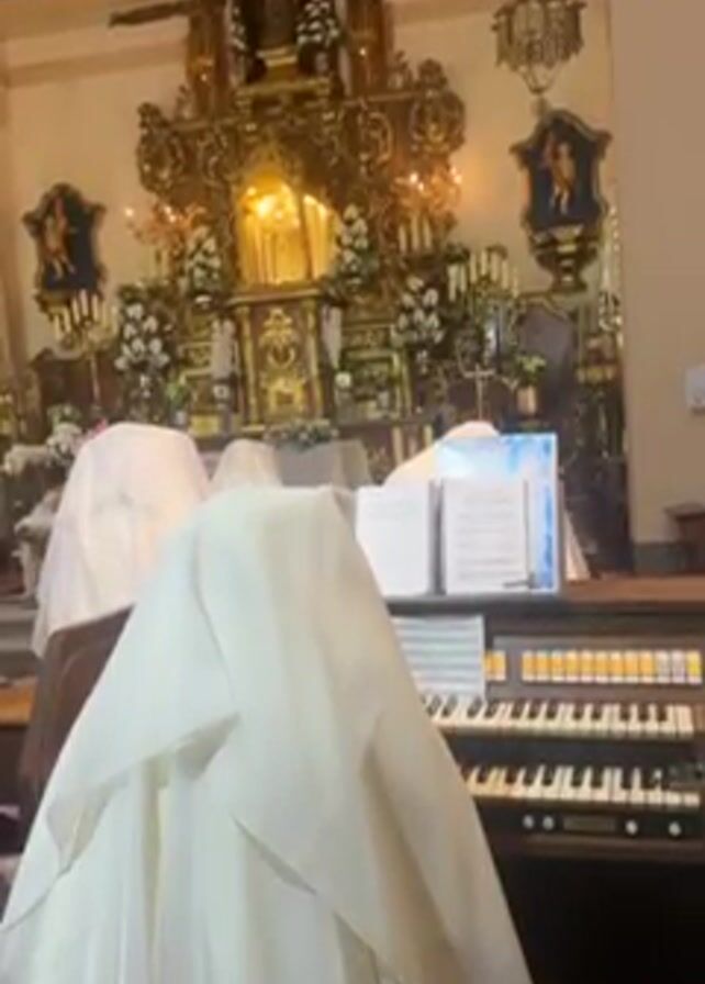 interior of a church. In the foreground, there's an organ covered with white fabric. Sheet music is placed on a stand. Behind the organ, there are three more objects similarly draped in white fabric, possibly other instruments or pieces of furniture. The church's altar is visible in the background. It's richly decorated with golden ornaments, flowers, and candles. Statues are displayed on the altar. The church's walls are light-colored with architectural details, including paintings near the ceiling.