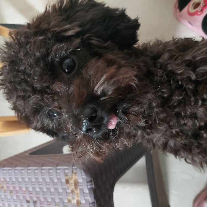 A close-up shot of a small, black poodle looking at the camera with its tongue slightly out. The dog's fur is curly and dense, giving it a fluffy appearance. Its eyes are dark and shiny. The dog is positioned near a brown, woven plastic stool or table with a wooden leg visible in the background. A glimpse of a pink and black slipper is seen in the upper right corner. The photo has a slightly rotated perspective.