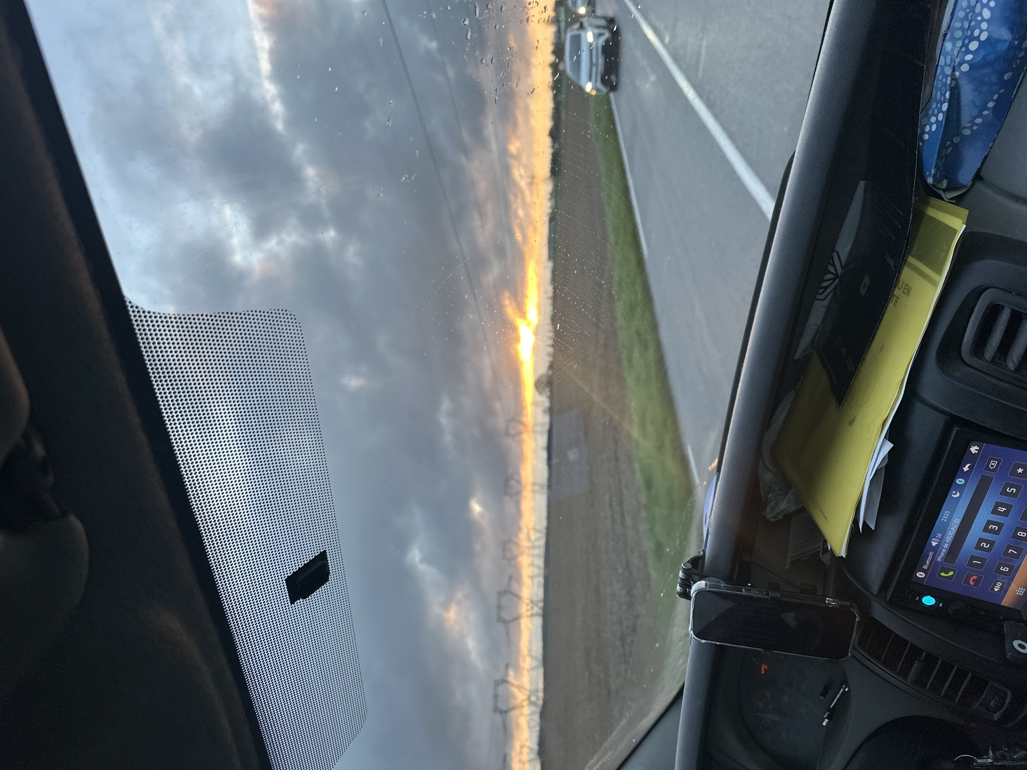 The image is taken from inside a vehicle, likely a car or truck, viewing the road ahead through the windshield