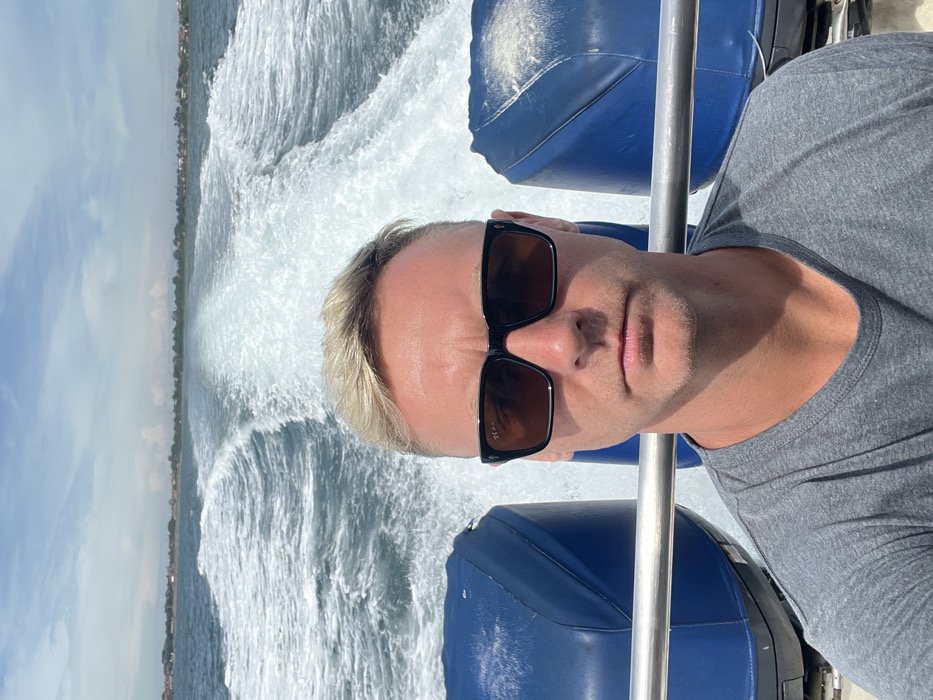 A man in sunglasses and a gray shirt takes a selfie on a boat. He's blonde with short hair. Behind him, a large wake of white water spreads across the blue water. Two blue boat seats are visible, with a metal railing. In the distance, land appears on the horizon under a bright sky with scattered clouds.