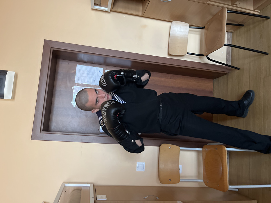 A young adult male, characterized by a buzz-cut hairstyle and an intense facial expression, is depicted standing in a boxing guard stance. He wears a dark blue sailor's uniform with a striped t-shirt collar visible, dark trousers, black belt, and black shoes. Black boxing gloves, with white text displaying "ADVANCED," are worn on both hands, held up in a defensive posture. The individual's gaze is directed forward, engaging the viewer. The setting is an indoor room with light peach-colored walls. A dark wooden door, framed in lighter wood, is centrally located behind the subject, with several white papers taped to its surface. To the left, a light-colored wooden chair with a metal frame is present, alongside a partial view of a light-colored wooden bunk bed structure and a white wall light switch. To the right, another similar wooden chair with a black metal frame is visible, next to a partial light-colored wooden shelving unit. An overhead rectangular fixture is seen above the door. Based on the uniform and institutional environment, the scene is situated within the Nikola Vaptsarov Naval Academy in Varna, Bulgaria.