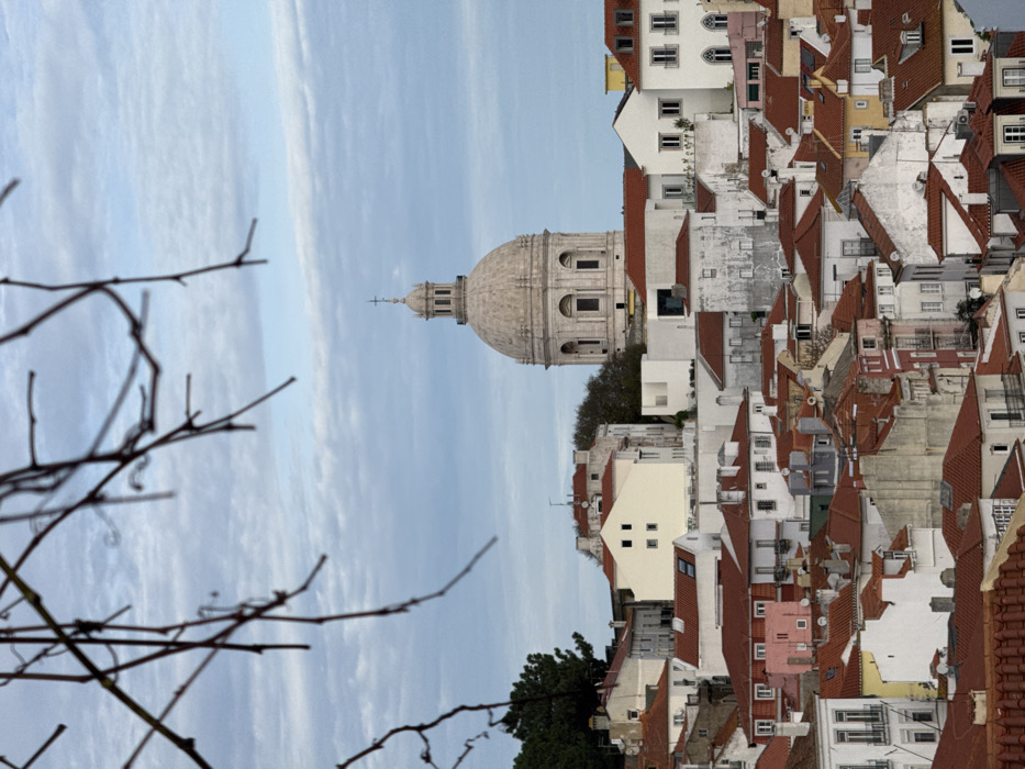 An elevated, wide shot captures an urban landscape in Lisbon, Portugal, on an overcast day. The prominent dome of the National Pantheon (Panteão Nacional), located in the Alfama/São Vicente de Fora district, is centered in the upper mid-ground. This light-toned stone structure features a classical dome, a smaller tiered lantern, and a cross finial, set against a light blue, cloud-streaked sky. Below and surrounding the Pantheon is a dense panorama of multi-story urban buildings, characterized by predominantly sloped terracotta tile roofs. Building facades exhibit a range of colors including white, off-white, pale yellow, and muted pinks and greys, with visible windows and some balconies. Scattered tree branches, defoliated and out of focus, partially obscure the upper left and top central areas of the image. No individuals or discernible actions are present.