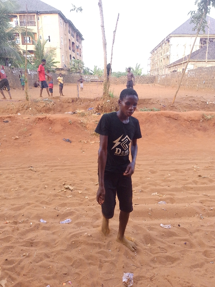 A young, slender Black man walks barefoot through a sandy, littered area. He wears a black t-shirt with a white design and black shorts. In the background, other people are playing or standing near a makeshift soccer field. Buildings can be seen in the distance. The ground is reddish-brown, and debris is scattered around, adding to the unkempt appearance of the area. The lighting suggests it is daytime.