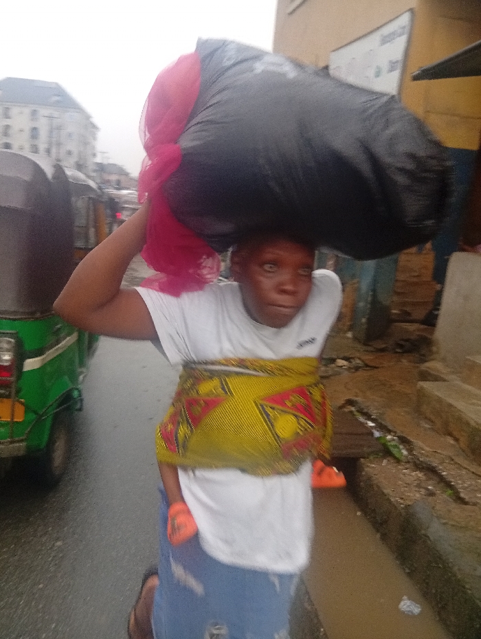 This image captures a street scene in Ura Nta Umuarandu, Nigeria. A woman is depicted walking, carrying a large black sack topped with red netting on her head. A child is secured to her back via a yellow, red, and black patterned fabric wrap; the child wears orange sandals. The woman is dressed in a white t-shirt, blue jeans, and brown sandals. A green and black Keke Napep (auto-rickshaw) is visible on the left. The asphalt street surface is wet, consistent with recent rain. In the background, multiple buildings, including a multi-story structure, are present. A concrete drainage ditch containing water and debris occupies the right foreground.