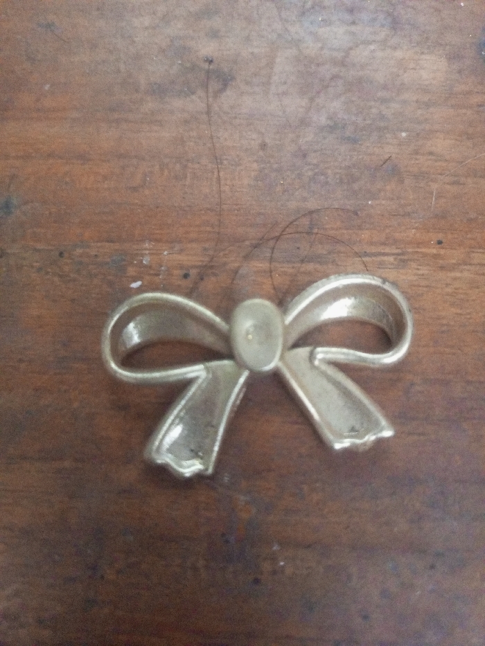 A single, gold-toned metal ornament, shaped like a bow, rests centrally on a dark reddish-brown wooden surface