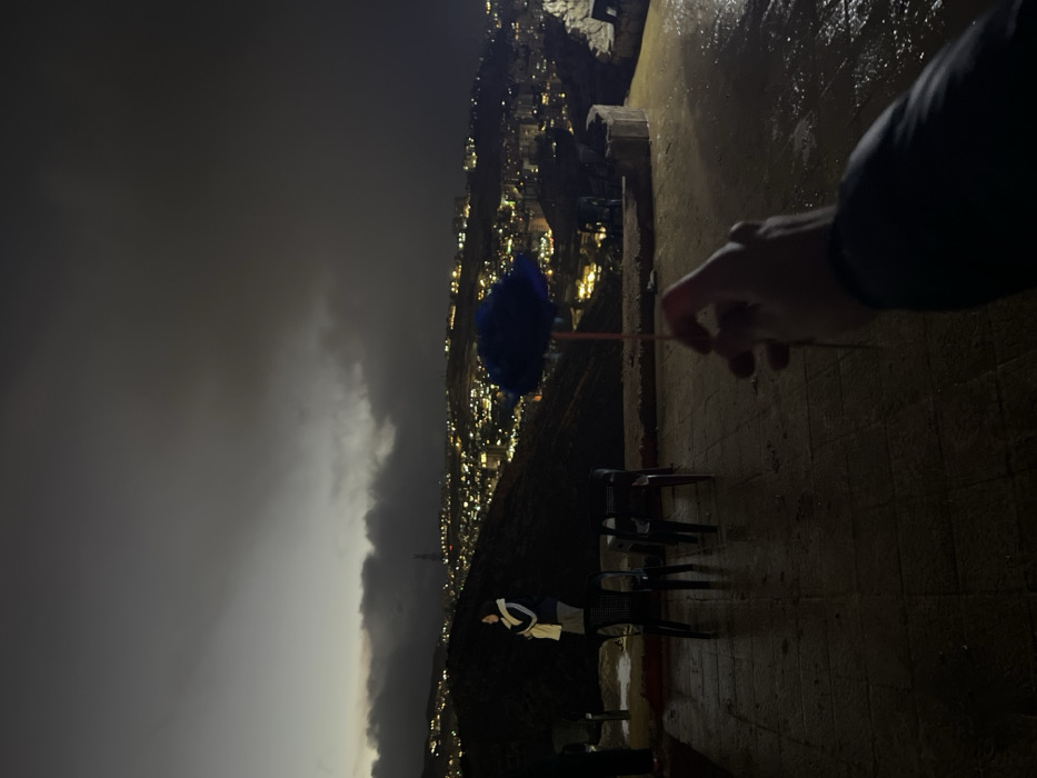 The image captures an elevated outdoor view of the city of Dummar Municipality, Syria, at dusk or night. The sky is overcast and dark, with hints of grey at the horizon. In the immediate foreground, a human hand holds a small, fluffy blue decorative object on a stick. The ground is a dark, tiled or paved surface, visibly wet and reflective. In the midground, to the left, a single person stands, mostly in silhouette, wearing a dark jacket and a light-colored head covering, facing away from the camera towards the city view. Two dark, plastic chairs are situated near this individual. A low concrete or stone wall separates the paved area from a dark, sloped hillside. The background displays a vast urban panorama, characterized by numerous illuminated buildings and streets spread across multiple hillsides, extending into the distant darkness under the cloudy sky.
