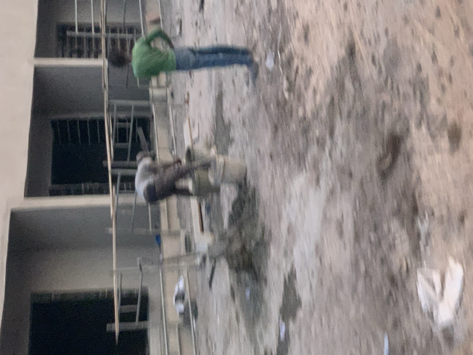 Two men are working on a construction site. One, wearing a green shirt and blue jeans, stands on the ground. The other, wearing a light-colored shirt, stands on scaffolding and appears to be working with a bucket. The scaffolding is near a building with barred windows. The ground is bare and uneven.