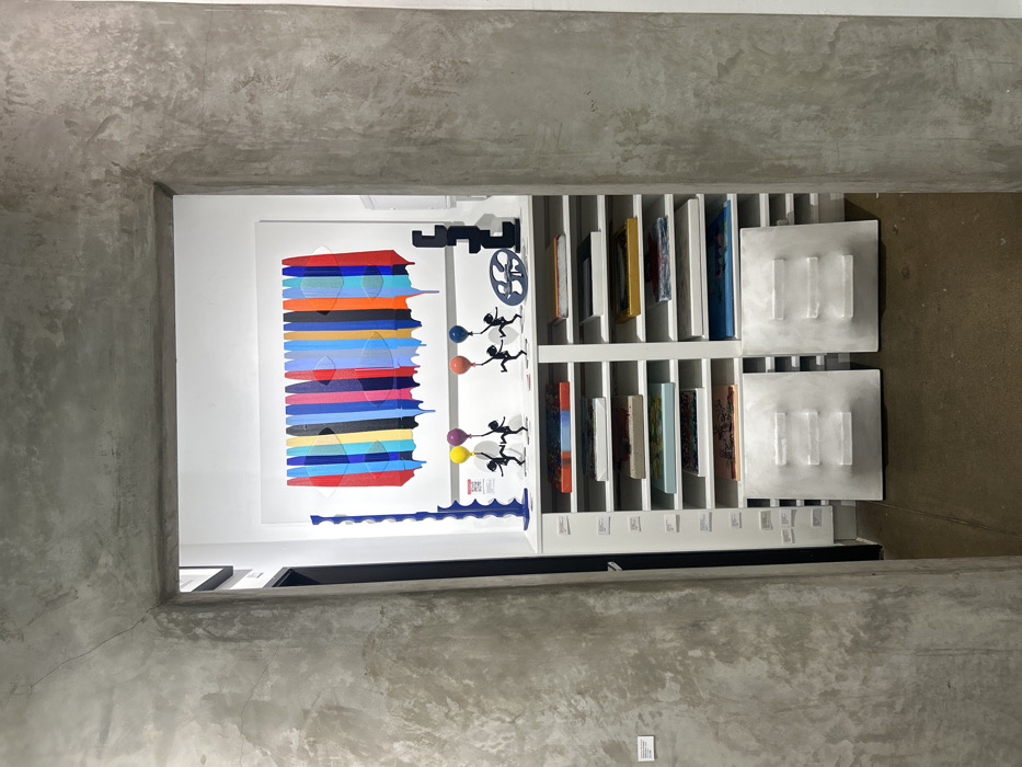 A framed view of a contemporary art installation. A large canvas displays horizontal stripes in vibrant colors. Sculptural elements, including figures with balloons and abstract shapes, are mounted alongside. Adjacent is a white shelving unit housing smaller artworks. Two white square sculptures with three raised bars each sit atop the shelving unit. The surrounding frame is a rough, concrete-like material.
