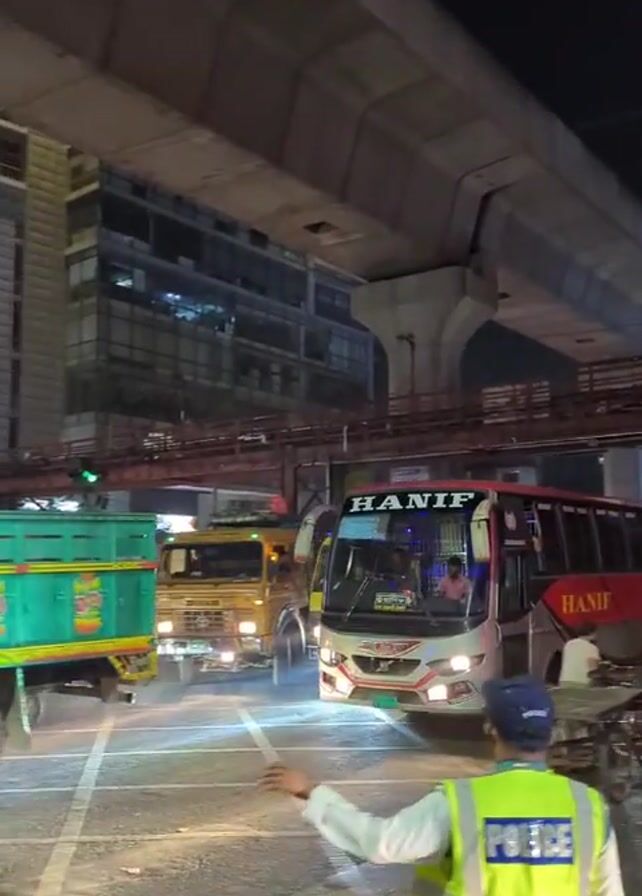 At night, traffic passes through a city intersection underneath an elevated train track. A police officer wearing a reflective vest and cap stands in the foreground, facing towards several vehicles. A brightly decorated truck is on the left, followed by a yellow truck and a white and red bus labeled "HANIF." Cars, motorcycles, and auto rickshaws are also visible driving in the intersection. Buildings and signs are visible in the background. A man walks in front of the bus. The traffic light is green.
