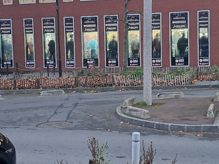 A brick building features numerous narrow windows, each displaying mannequins dressed in contemporary clothing. Branding above each window reads "ARTEXTYL" and "Amazone." A low, wooden fence separates the building from a gray paved area. A small roundabout with concrete edging and a few young trees sits in the foreground. The overall scene is urban and somewhat autumnal, with fallen leaves scattered around.
