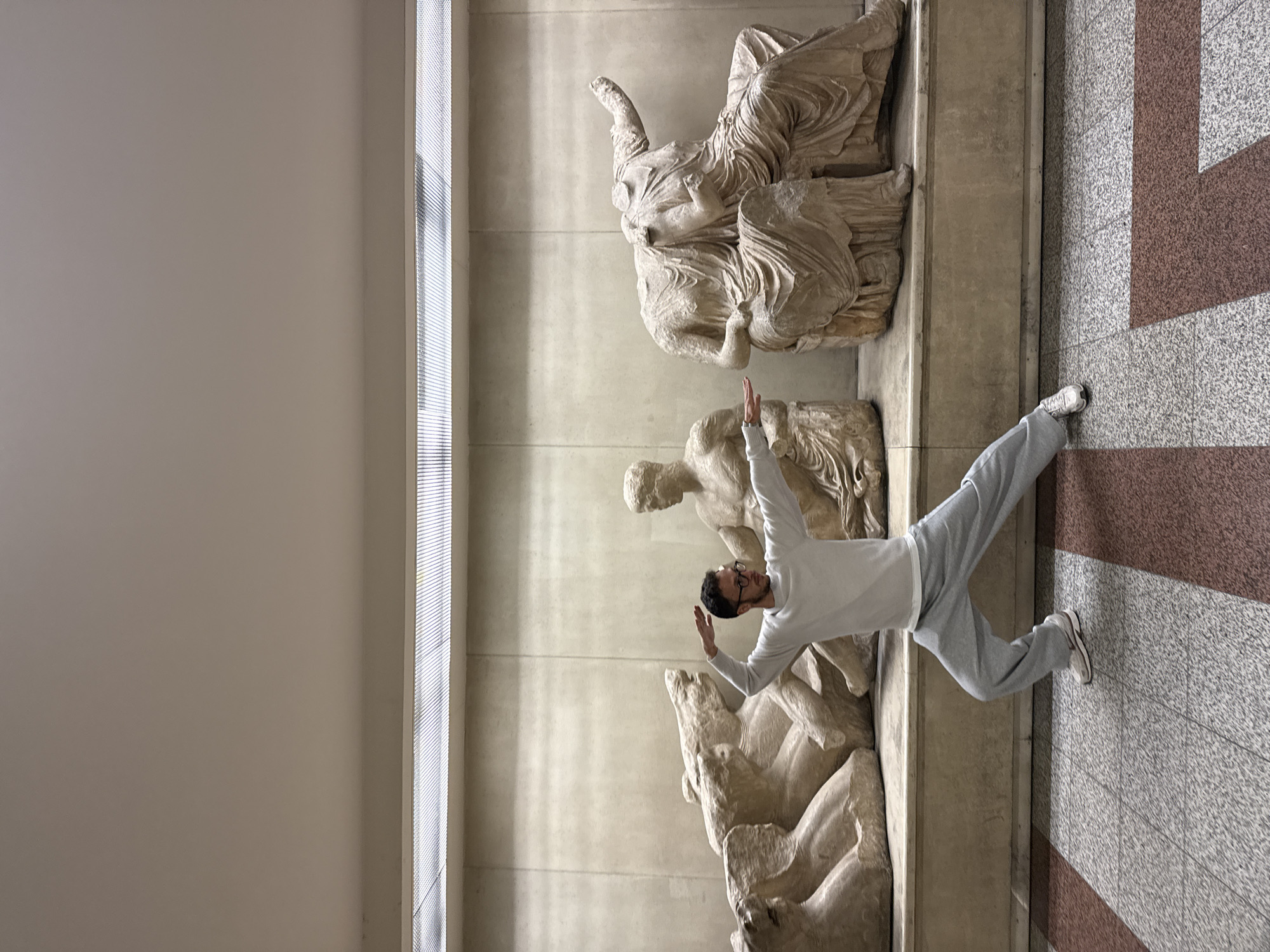 A man in gray athletic wear is leaping in front of ancient Greek marble sculptures at the Acropolis Museum in Athens, Greece