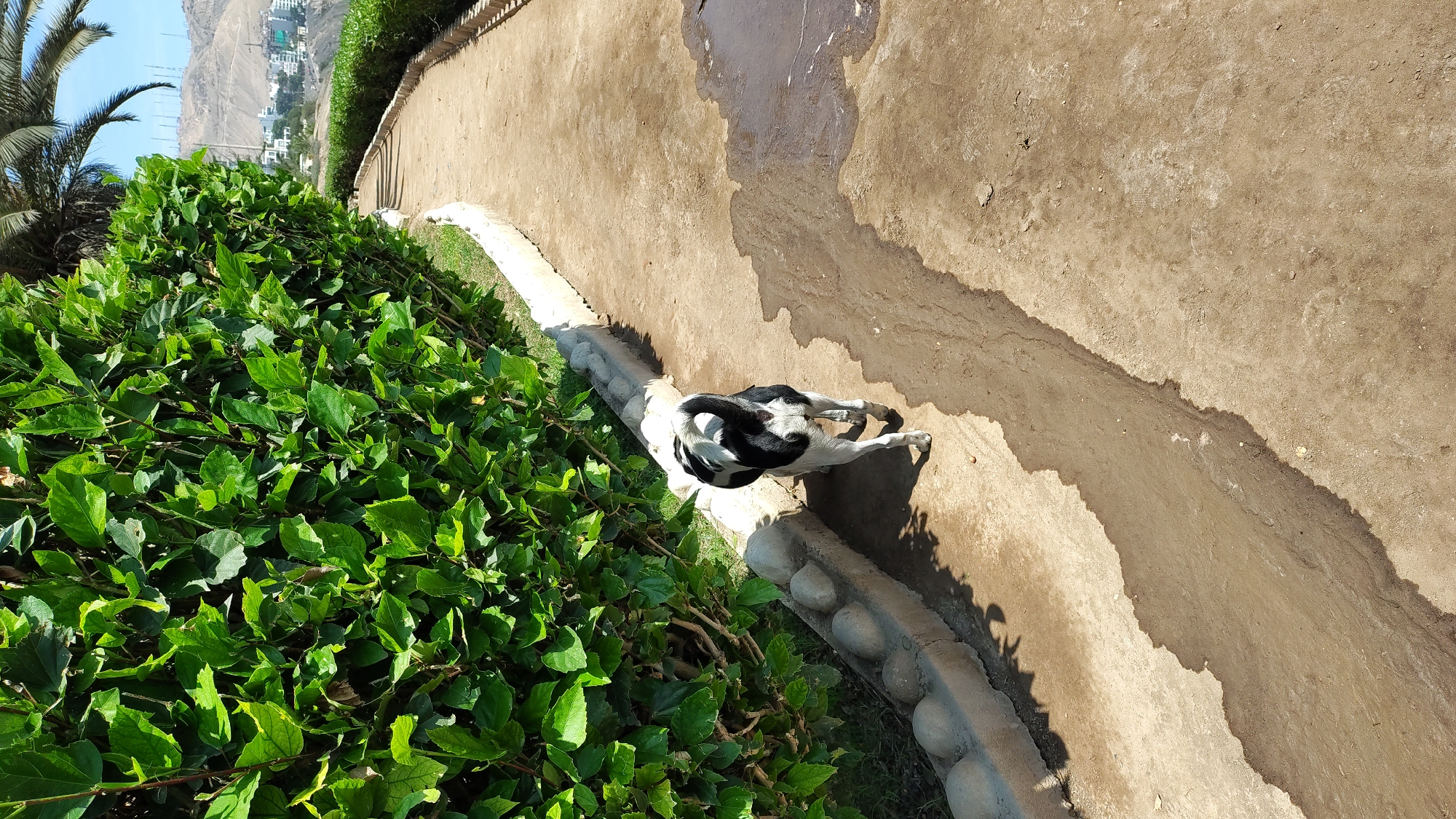 An outdoor scene in Barranco, Peru, depicts a black and white dog walking away from the camera on a dirt path under direct sunlight. The dog, with a black body and white markings on its legs and tail, is positioned in the lower center, its tail curled upwards. To the left, a dense, vibrant green hedge with numerous leaves forms a continuous barrier, bordered at its base by a low concrete curb featuring evenly spaced hemispherical protrusions. The unpaved path is mottled brown, exhibiting several irregular, darker patches consistent with damp earth or standing liquid, particularly a prominent, winding channel running longitudinally down its center. In the upper right quadrant, a portion of a palm tree frond is visible. The background reveals a distant, arid, light brown hillside dotted with white residential structures and multiple thin, vertical antenna-like objects under a clear blue sky. Strong shadows are cast by the foliage and the dog, indicating a high sun angle. No human subjects are present.