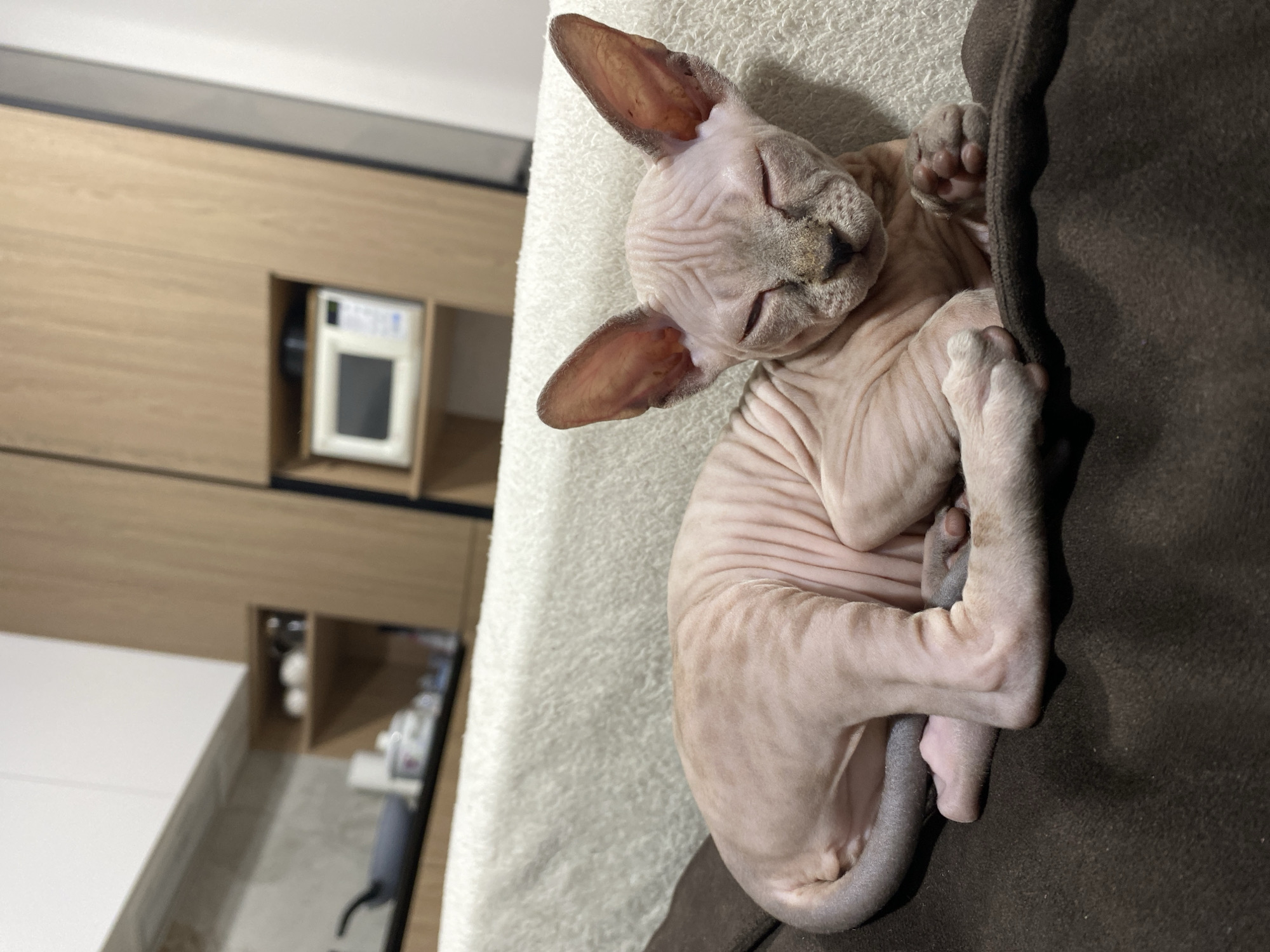- "A light pinkish-tan Sphynx cat with visible wrinkles is observed sleeping soundly, curled on its left side on a dark brown plush surface" by FM-jtf3g2, licensed under CC BY 4.0