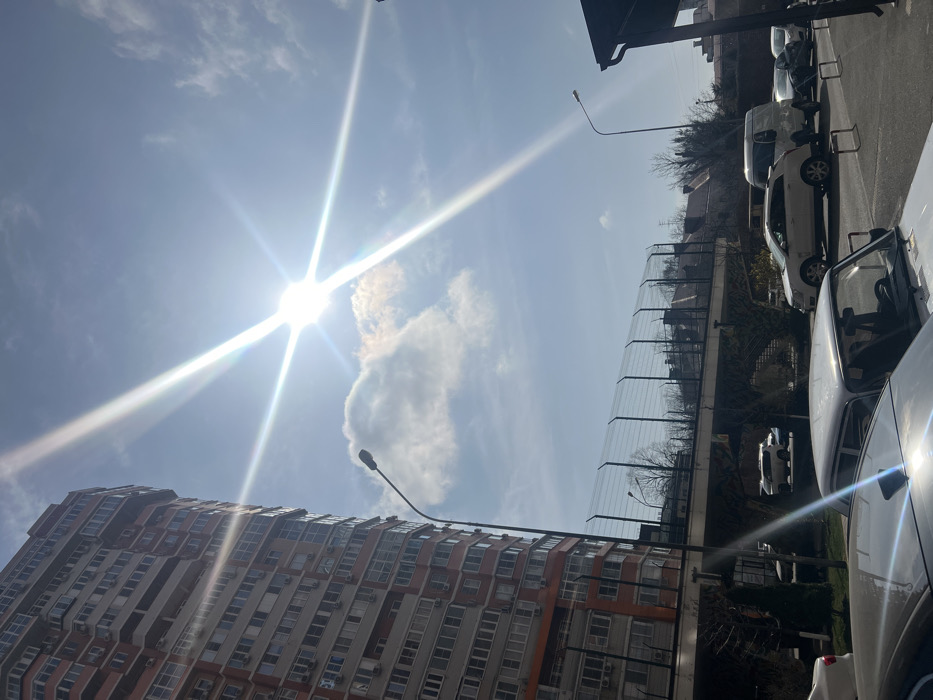The image depicts an urban street scene in Krasnodar, Russia, under bright daylight with a clear sky. The sun is prominently visible in the upper right quadrant, producing a distinct lens flare with four prominent rays. A tall, multi-story residential building, characterized by its light-colored facade, numerous windows, and multiple external air conditioning units, dominates the left side of the frame. In the mid-ground, an elevated concrete structure, possibly a pedestrian bridge or overpass, spans horizontally across the scene. This structure features a tall, dark metal fence, likely chain-link or mesh, along its length, and its underside displays support beams and what appears to be a mural or graffiti. On the ground level in the foreground and mid-ground, an asphalt surface serves as a parking area where several vehicles are present. A silver or white sedan is partially visible in the immediate foreground. Further back, a white crossover SUV and a white cargo van are parked alongside other vehicles. No individuals are visible. Two dark-colored street light poles with single luminaires are present, one on the left extending upwards and another on the far right. Bare deciduous trees and some evergreen foliage are discernible in the background, behind and beneath the elevated structure, indicative of a dormant season. The overall environment is an active urban area. While identified as being in Krasnodar, no specific street names or unique architectural landmarks are discernible to pinpoint an exact address within the city.