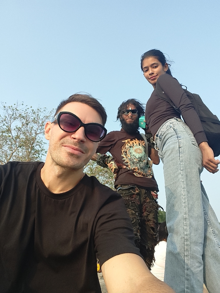 A low-angle daytime photograph depicts three individuals posing for a selfie outdoors in Kochi, India