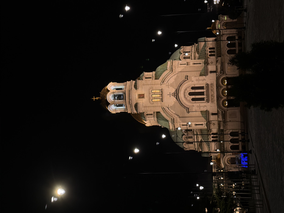 The image displays the St. Alexander Nevsky Cathedral in Sofia, Bulgaria, observed at night. The cathedral's large, ornate structure is illuminated by warm-toned artificial lights, revealing its cream-colored facade, multiple green oxidized copper domes, and a prominent golden central dome crowned with a cross. A smaller, similar golden cupola and bell tower structure are visible atop the main edifice. Arched windows, some emitting a yellow light, are present across the building's various architectural tiers. The foreground consists of a cobblestone-paved plaza. Numerous dark lampposts with glowing white light fixtures are positioned throughout the scene. To the left of the cathedral, near the ground level, a blue illuminated sign displaying the Cyrillic text "АФИС" (AFIS) is visible. Dark, indistinct foliage occupies the immediate foreground. The sky is uniformly dark, indicating nighttime conditions. No individuals or active interactions are present within the frame.